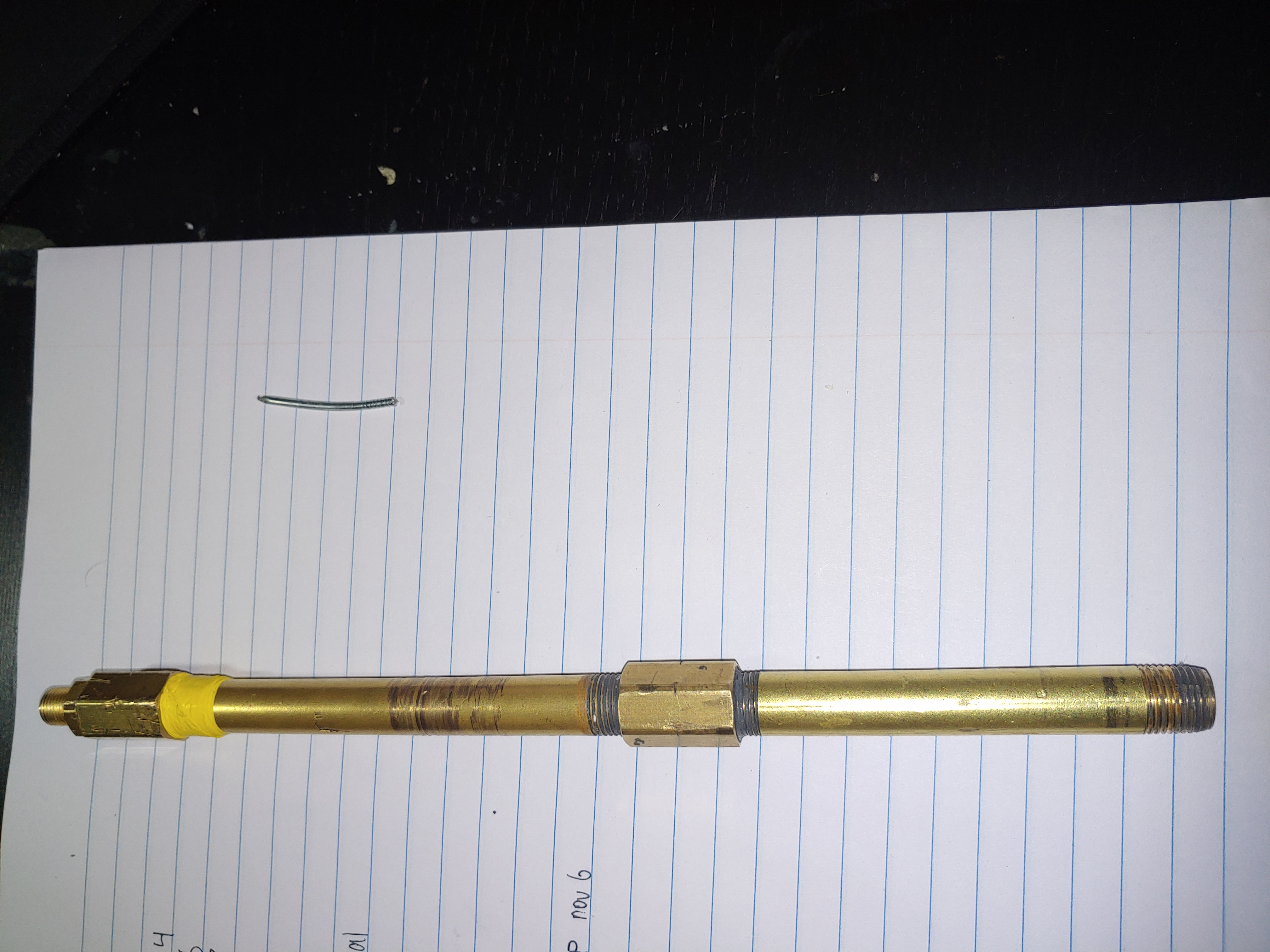 The build is made up of two 1/8" brass pipe nipples coupled together, with an OD 7mm ID 6mm stainless tube epoxied inside. Inside of that ...