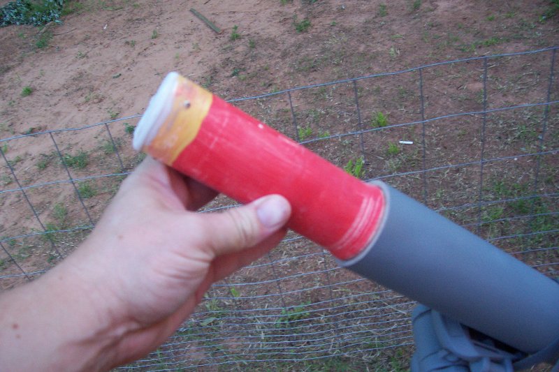 Here is a pic of my 1 1/2" diameter shell for my 2 inch mortar. I didnt have a cap at the time so i just used bondo to plug it up, bondo is great stuff! I flared out the bottom of the shell in a tin can of cooking oil and pushed it down on a funnel, was not hard at all. Im gonna make a few more since i have a 10' piece of pvc now. I was shocked at how far this thing shot.