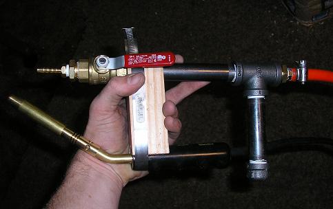 pimpman, not sure what you mean but if it was mine, i would have put a 90* bend where the cap is on the rear grip, and run a pipe straight forward and then capped it. to that pipe running parallel to the main body of the gun i would have clamped the torch to it. but like i said, i didnt design any of it but the chamber. and more parts means more money and the price was negotiated for a specific set up and thats what he got.