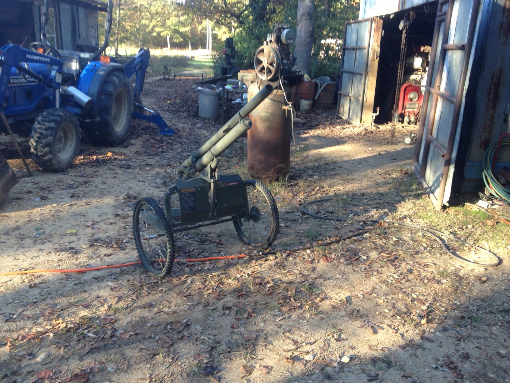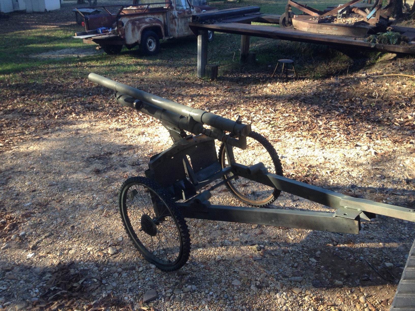 it is made out of a bicycle, treadmill, satellite dish components, a sprinkler valve, and some PVC pipe. It was mostly junk i had laying around the shop.The air tank is made out of a satellite dish post i cut it to length and welded ends on it. i put a metal valve stem on one end and a 3/4 threaded female coupling on the other and an air Gage in the middle from there i put a 3/4 inch pipe nipple then a yard sprinkler valve or solenoid valve. then another 3/4 pipe nipple to a 3/4 to 1inch reducer. from there i made a 90 degree bend out of some tubing and welded the reducer to one end and the other end to a piece of 2 inch by12 inch pipe. from there i jb welded a 2 inch PVC sleeve onto it and then added the 2 inch PVC barrel. i used the aiming part of a satellite dish to mount it to the carriage it works good because it has the degrees stamped into it. I have about $50 in it and built it in about two days. It will fire a golf ball 400-500 yards at 160 psi on a 45 degree angle and put a hole through a industrial garage door at 30 yards. let me know what you guys think.