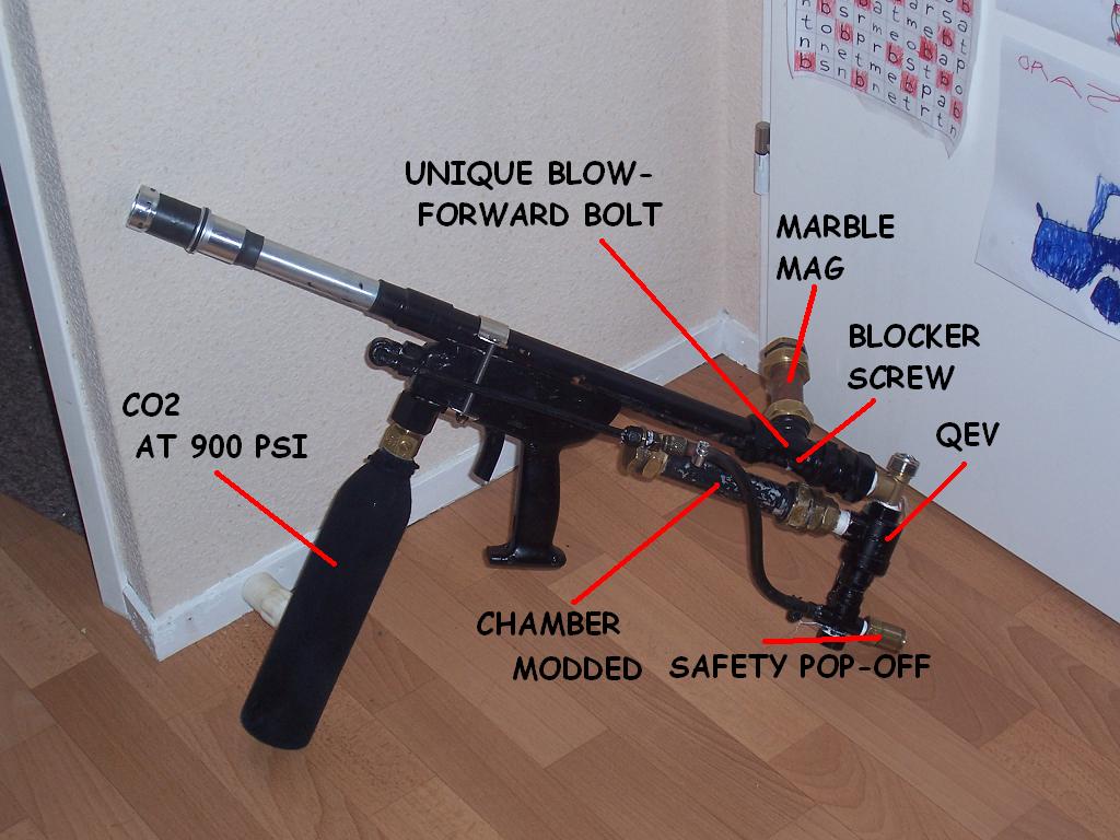 - THe "blockerbolt" is fixed to the tube in wich the blow forward bolt slides.In other words; it doesn't move, only the blow forward bolt does.It runs through a slot in the bottom.As the bolt is moved forward the marbles roll off the blocker and drops in line with the barrel to be fired.The hole in the top of the B.F., bolt provides the nessecary space for this action to work.The blocker also inhibits the blow forward bolt from turning, wich would mis aline the "drop-in"hole at the top of the B.F. bolt.