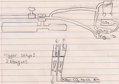 as for the blowforward unit, yes im starting to believe you are correct, while i can make work by partialy choking off the flow, i dont want to sacrifice power. i say a piston actuated semi auto by pvc arsenel, and i believe i can use that basis to make a working semi auto, only changing that the piston is hooked up to the tank (i still will be using a QEV to fire)