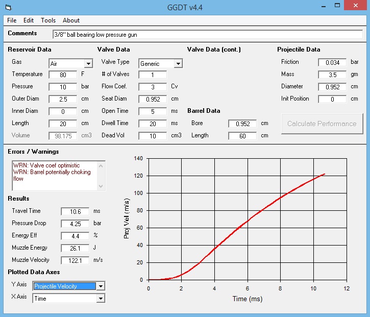 Here is a simulation of what performance you would get at 10 bar with a 60cm long barrel, you'd get just over 25 joules of energy and decent velocity, good enough for 150 feet.