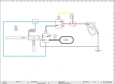 Time to call it finished, compressed air (135 psi) powered, 10mm ball bearing ammo, semi automatic, magazine holds 10 + 1 in ready. The stock is the chamber (1 1/2" pvc), barrel is 1/2" OD seamless stainless tubing (10.2mm ID) 700mm long. Main valve (3/8) is controlled by pilot valve (1/8) pulse, this pulse can be adjusted by the air restrictor to give different times/power. Valves are pilot air actuated 5/2 spring return, but had to add external pilot air to main valve as I was feeding it through an exhaust port not the P port.