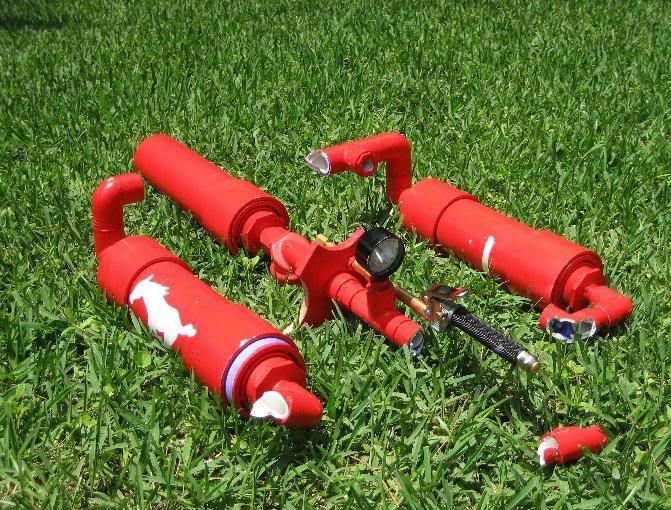 Missing parts in second pic include a control panel with enable switch, fire push button, vintage DC voltmeter and lights. 3, 9 volt batteries to power it & really BANG that sprink solenoid open. I'm an electrician by trade so any project must have lights, right? Firing recoil would bust out the lights & wrecked the voltmeter. control panel has been scrapped.