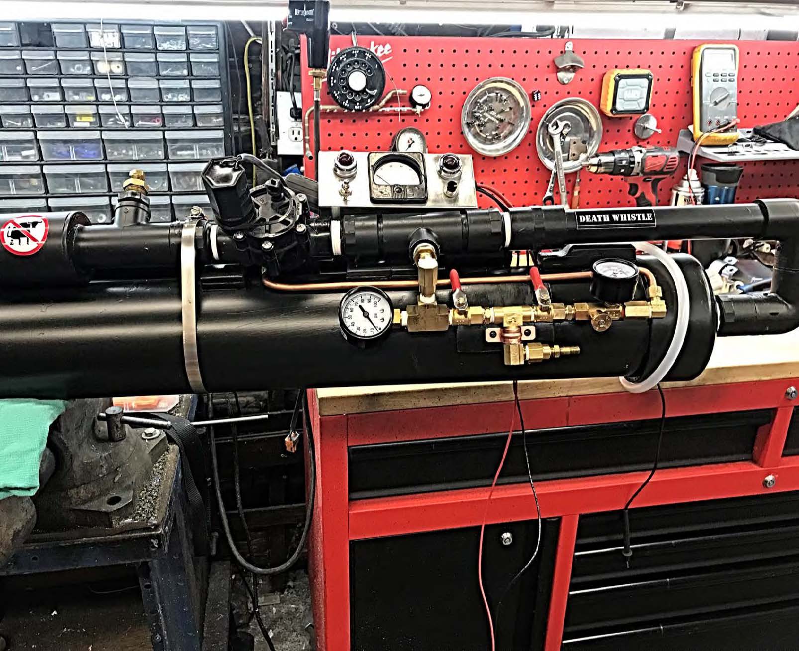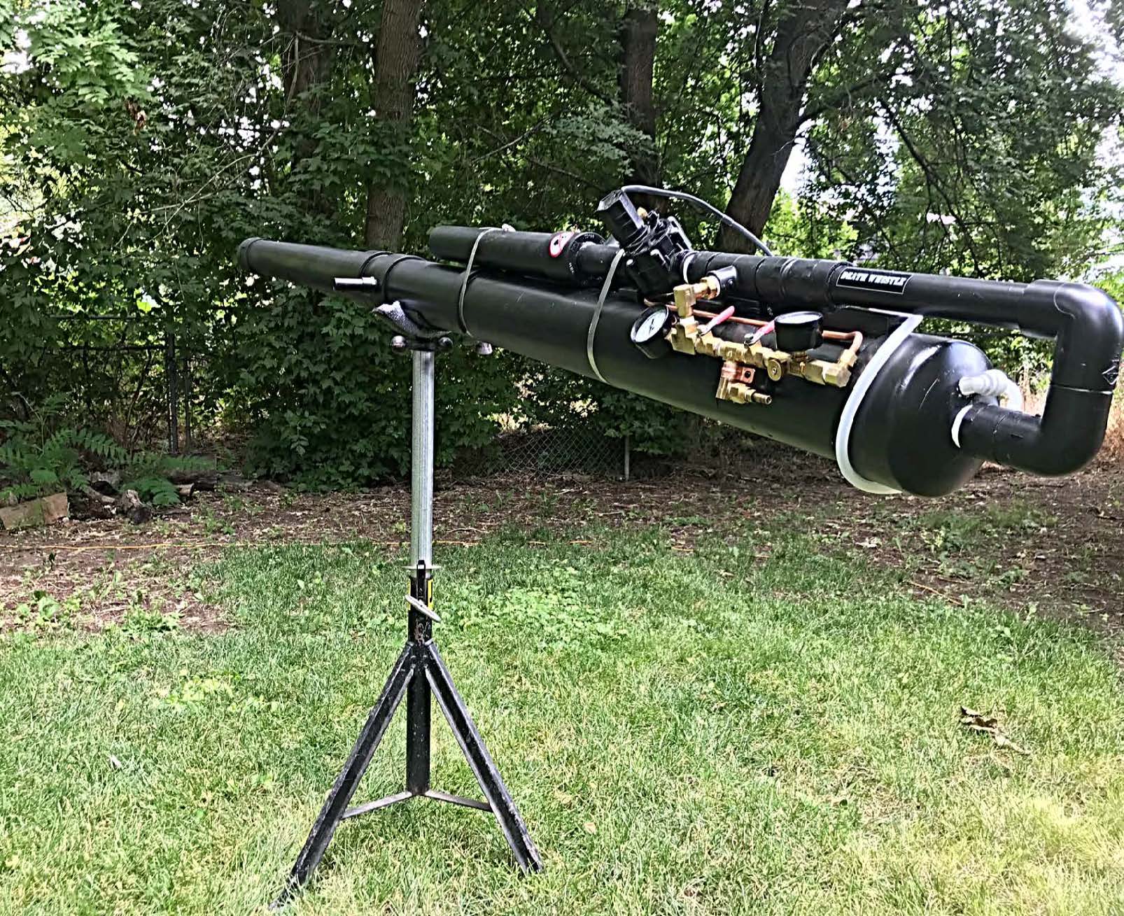 No bullshit sticker is mine, but the name 'DeathWhistle' came from a suggestion to another user on this board. Name is amazingly appropriate. I put 2" pipe on the valve exhaust hoping for cool noise. the chamber has way more voulumn than necessary to launch the ball, so remaining air escaping makes a wheezing, dying train whistle sound.