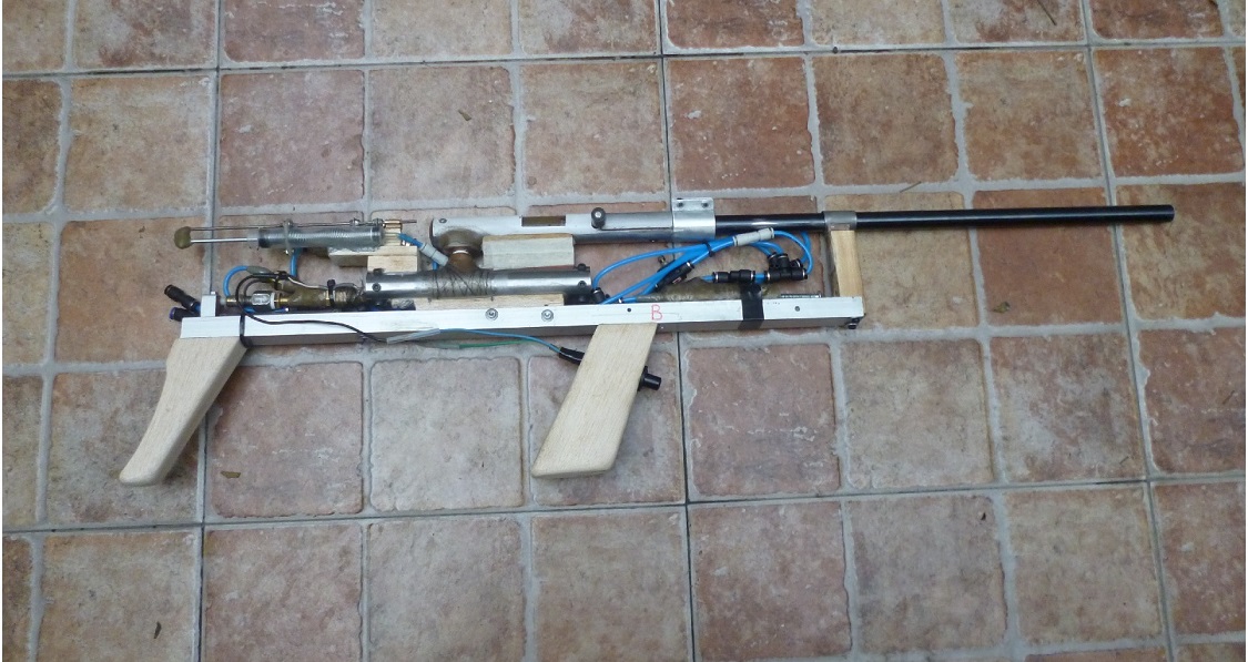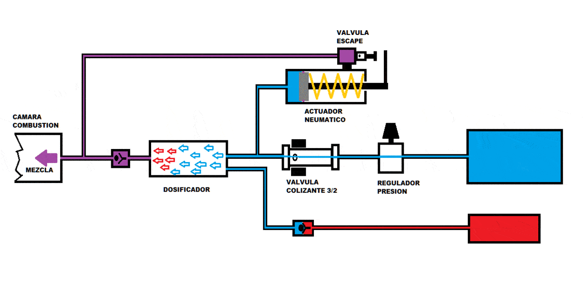 The "Pneumatic timer" is used to determine the gas inlet time to the doser, about 1.5 seconds. The idea is simply to pull the handle and release. This automatically performs the opening and closing of the exhaust valve, the gas charge and its dosage, and the butane-air mixture charge in the combustion chamber. The system is relatively wasteful, a little air, (is a problem that solves many other problems, more important), in favor of having on board the weapon, the smallest possible number of elements.