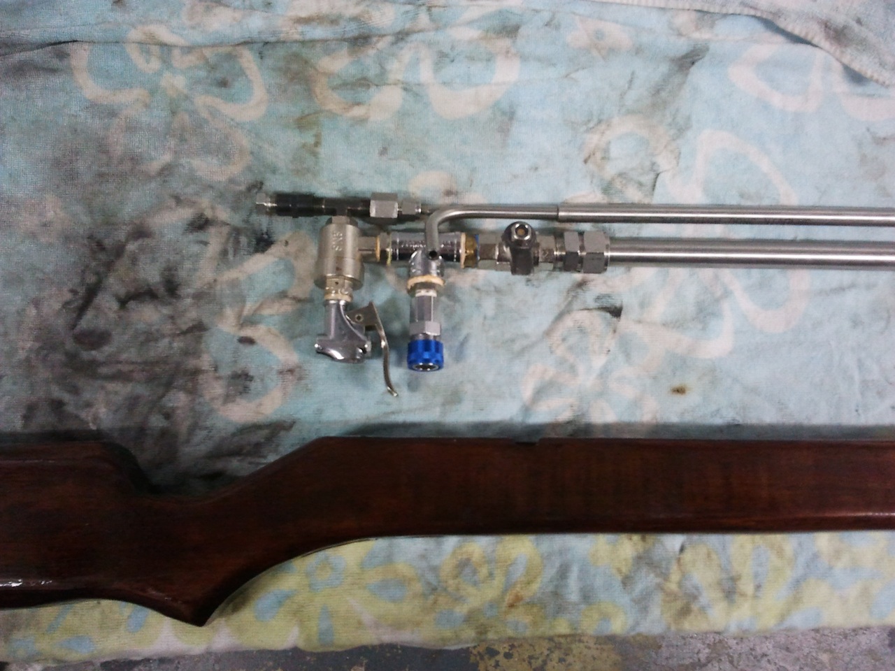 That's quite a beautiful gun you've made! If you can afford it, you could mod the air tank to fit a PCP pump, and then you'd really be in business.