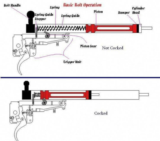 Smaller bar or rod for spring guide / has a flat disk on back , which is held against a bar / spring guide stopper that comes from trigger mech ,inturn allows the piston and spring to be compressed and sear to be engaged .