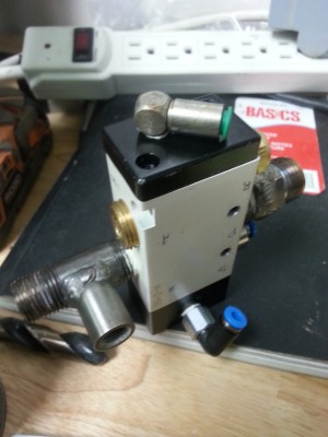 The final pneumatic circuit, the flow restrictor adjusts cycle time by delaying the opening of the pilot valve which closes the main valve, all the pilot lines are 4mm OD.