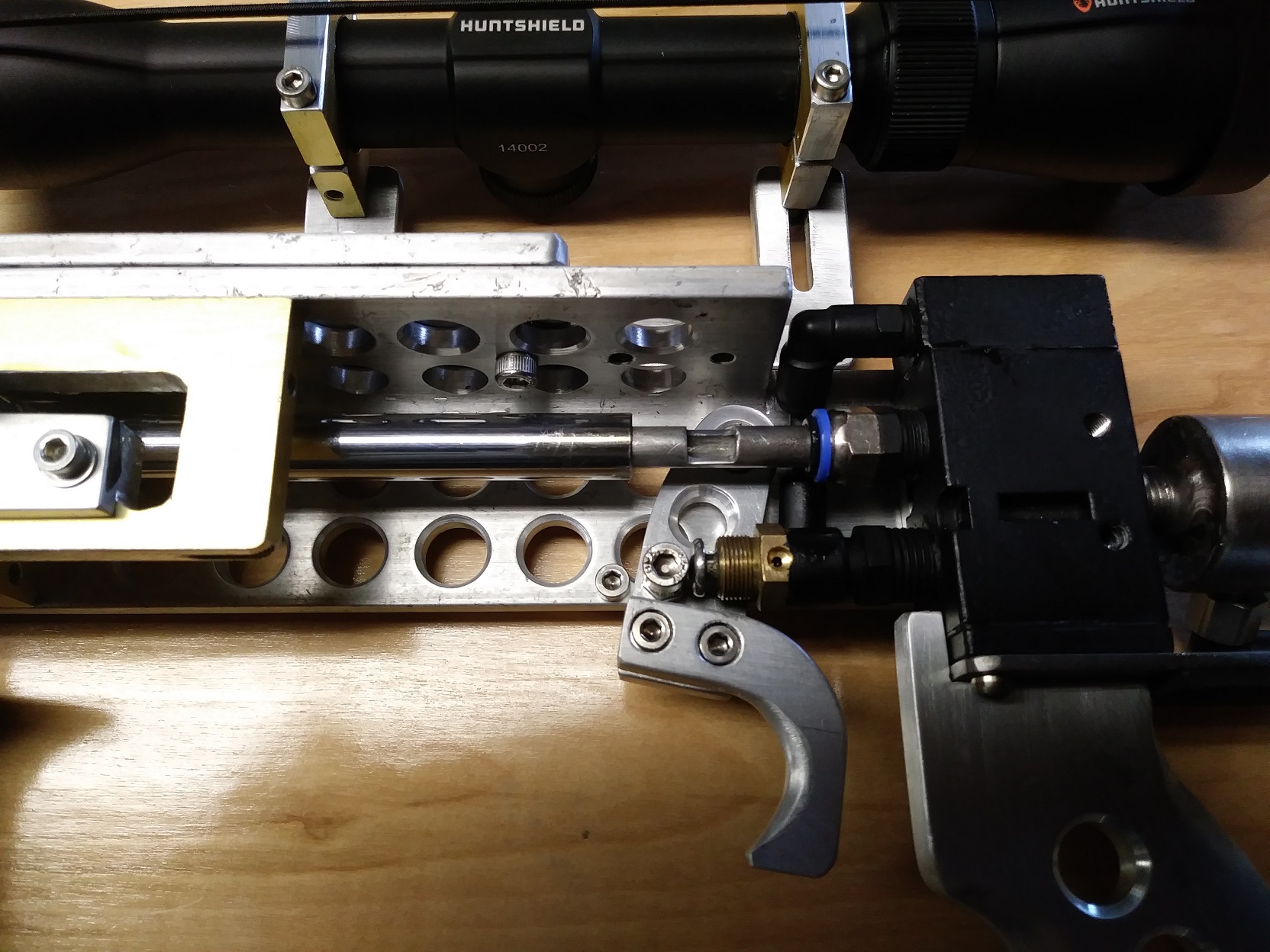 Finished the compact .177, barrel is 12" long. 11" if you allow for the dead space, valve is 1/4" pilot operated, accuracy as expected, about 1 1/2" group at 9m. Running straight off compressed air as usual at about 150psi. One of my favoritist guns to shoot so far