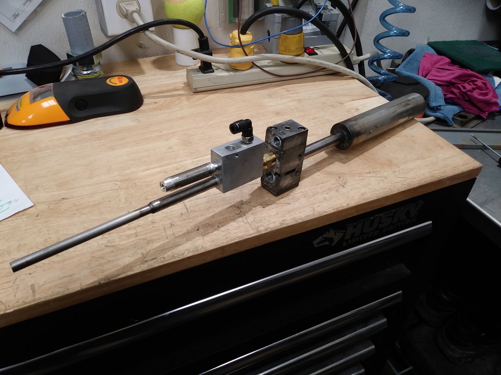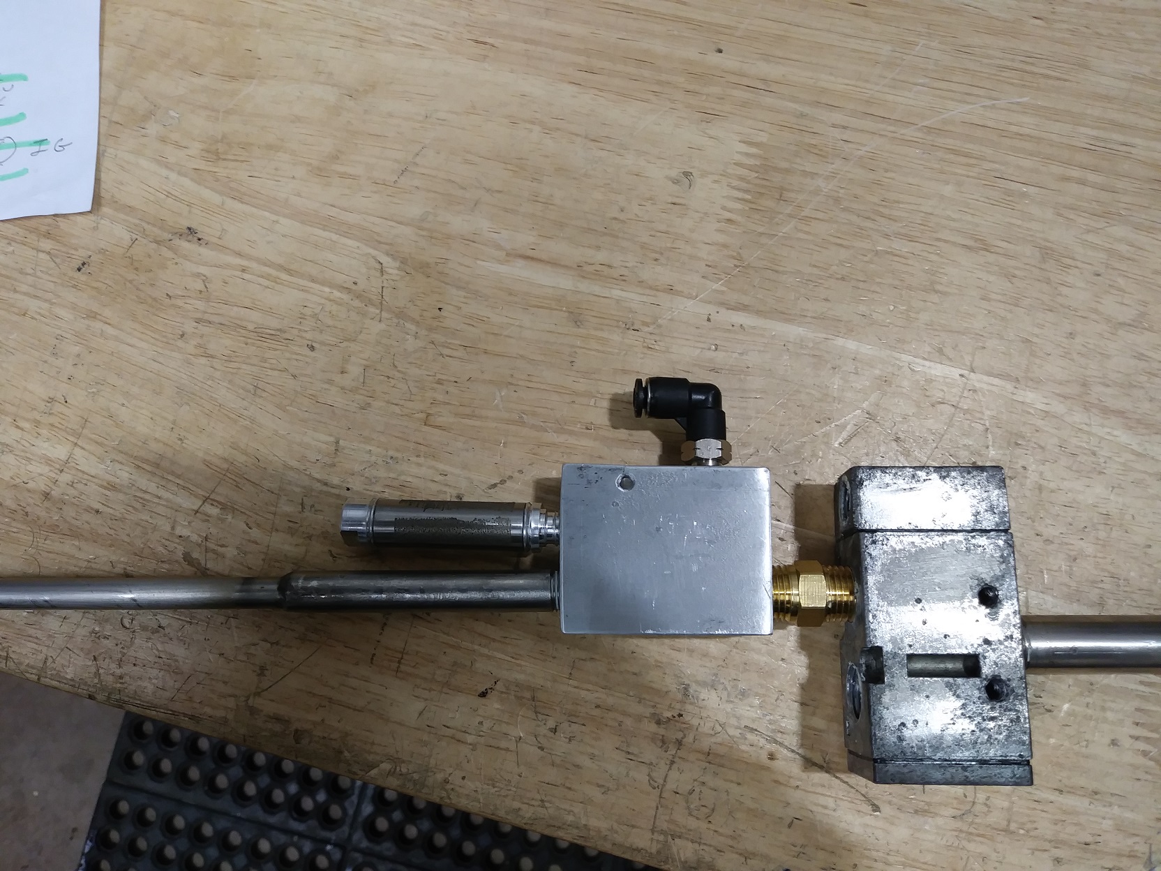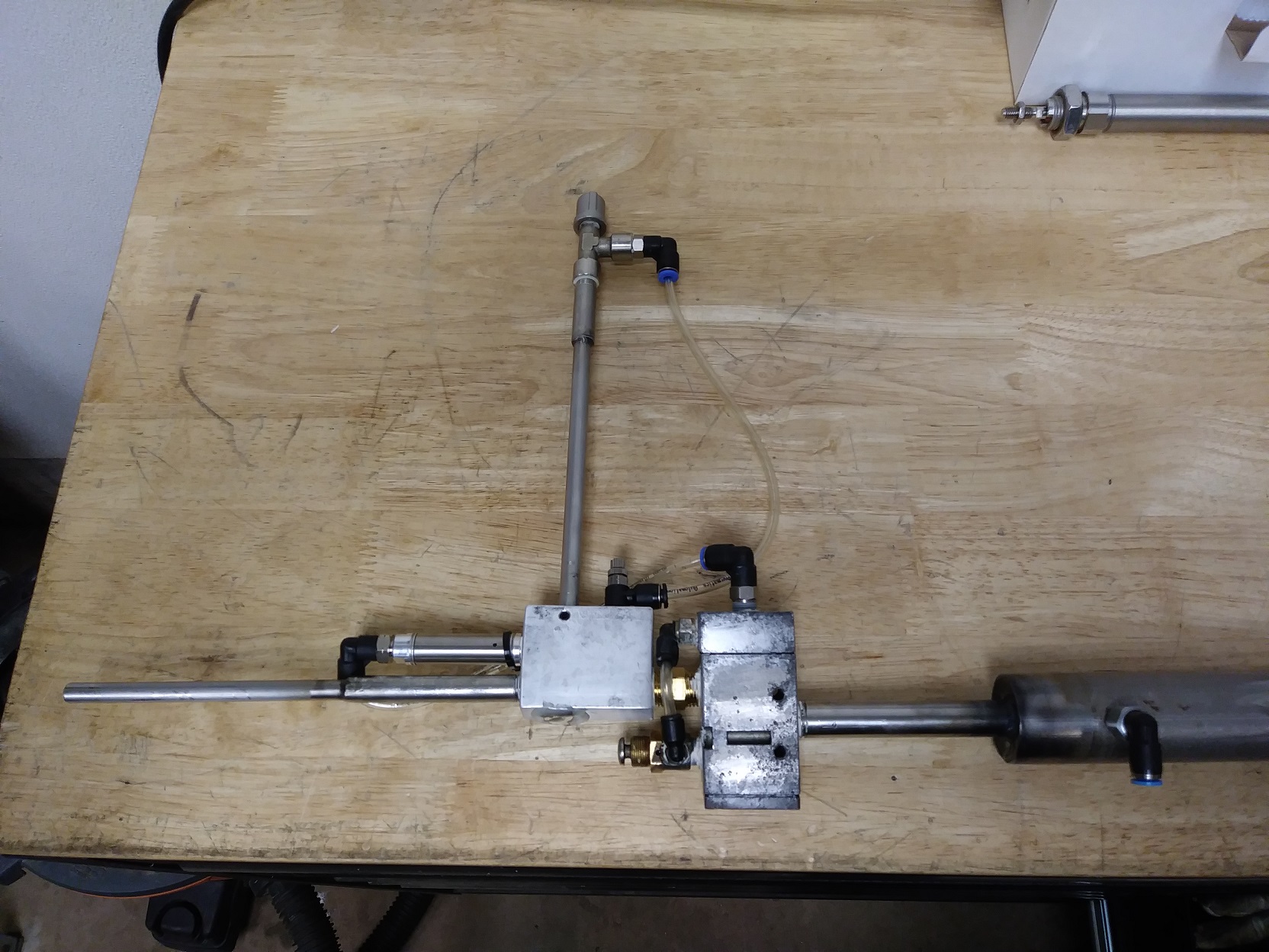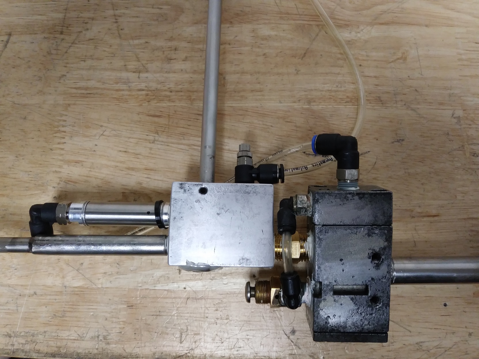 Had to change it a bit as I realized there wasn't enough pressure in the barrel to operate the blocking cylinder, had to move it to the pilot supply which stays at full pressure. Tried a gravity fed mag but that won't work unless it has some pressure on top to keep the BB's down when firing, finally got the burst fire to work
