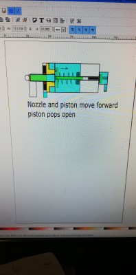 Piston valve, nozle normally in closed position (retracted).off 3 way N. O. Valve. front of piston pilot.