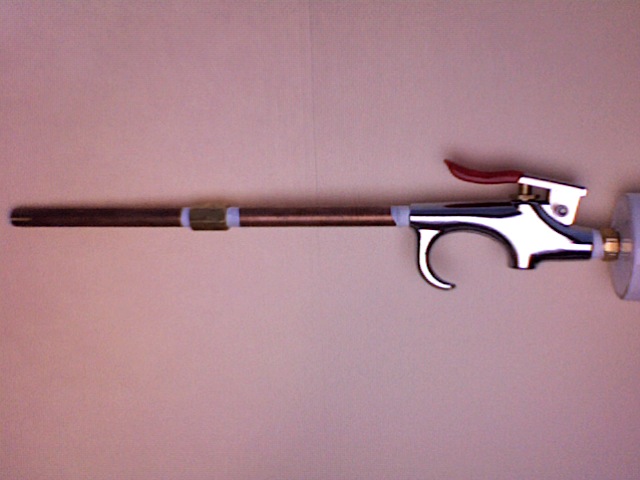 This is my mini pneumatic. It uses a blowgun as a valve with 1/8" brass pipe as the barrel. The chamber is 1 1/4 inch with two endcaps making up the entire length, I just cut enough pipe to join the two. I built this because my dad claims that my butane mini is a fire hazard.