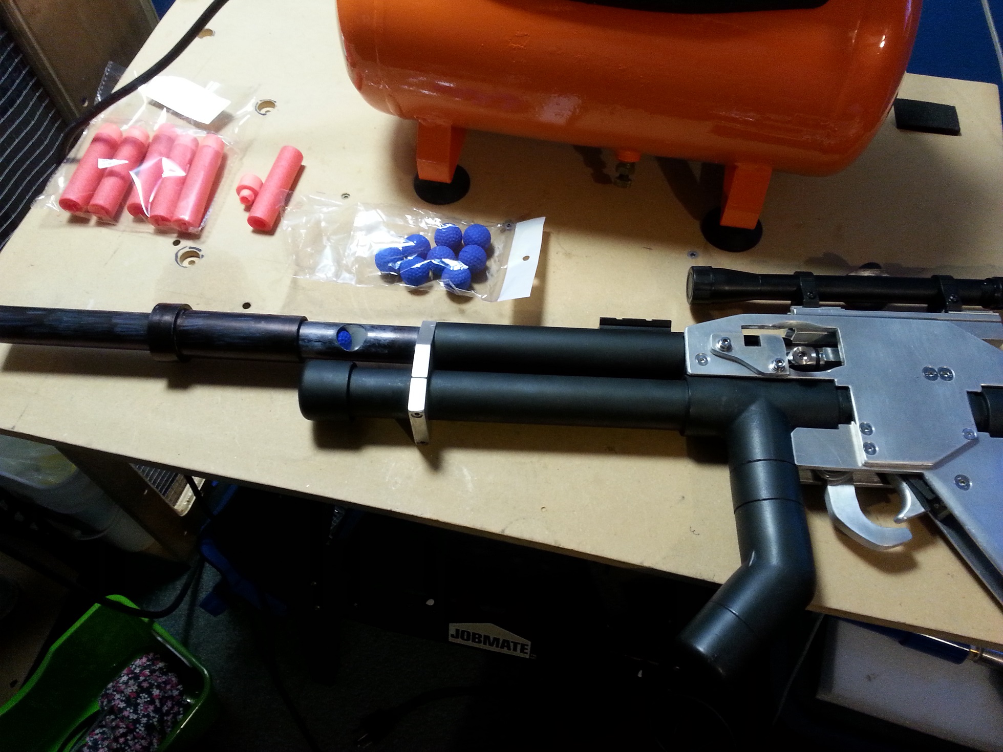 I have made an attachment for my airsoft launchers with 10mm OD barrels, it just has a sliding section and a hole to insert the foam ball. It is 3/4" Sch40 PVC, 20mm ID. The balls are Nerf Rival and are 23mm OD, so a nice airtight fit. I fired a couple at 80psi and even with all the dead space it was pretty impressive, the nerf dart not so much, it blew the foam head off as it left the barrel