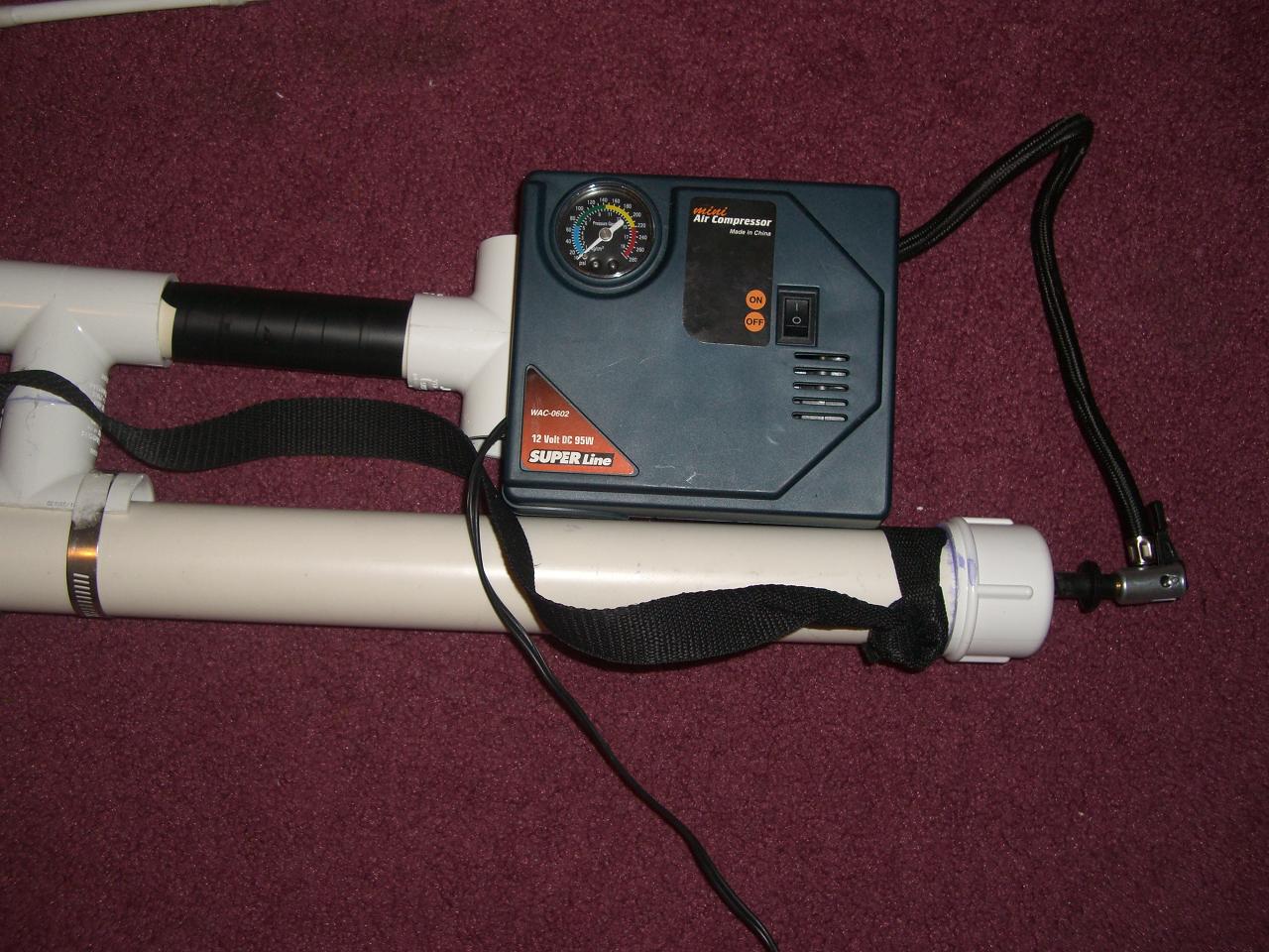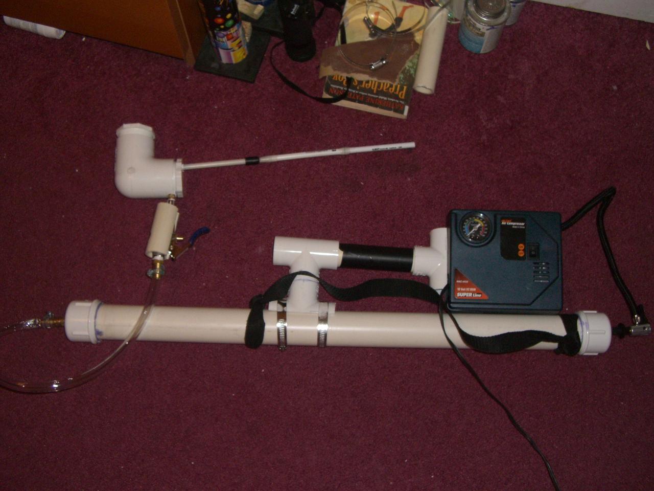 Well , here it is my first BBMG. My parents dont let me have an air compressor so i made my own it is portable, and has a 24v battery modded inside the electric pump. The Tank last a good 9 seconds at 65 psi. I Made the gun out of a 1.5 inch elbow and a screw on cap on top, my barrel is made out of a plastic tube i found that fits bbs well, But im getting breakline on the weekend there 6mm bbs im firing. Im buying a new longer strechable hose on the weekend too.