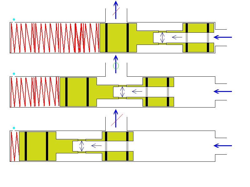 The idea here is that the piston has to travel a certain distance to open the firing port, it's that delay which I'm hoping will give time for the pressure to build up. Of course it's important the the feed into the chamber is significantly less than the firing port, otherwise there won't be a pressure drop sufficient to allow the piston to reset.Have fun trying to find a spring strong enough that will let enough pressure build up in the chamber for a decent sized shot.