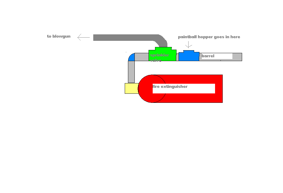 this is a paintball gun that i want to make ,the hopper goes in the t piece and the sprinkler valve is moded,this should be semi auto but i was toying with the idea of making it pump action.it uses a small fire extinguisher as a air source.