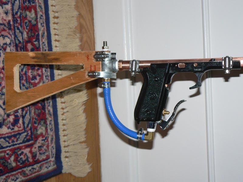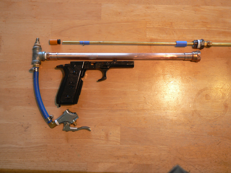 Why not tap the blowgun directly into the tee and extend a trigger rod into where the trigger is meant to be in the pistol grip? this will give you less pilot volume and a more ergonomic hold.