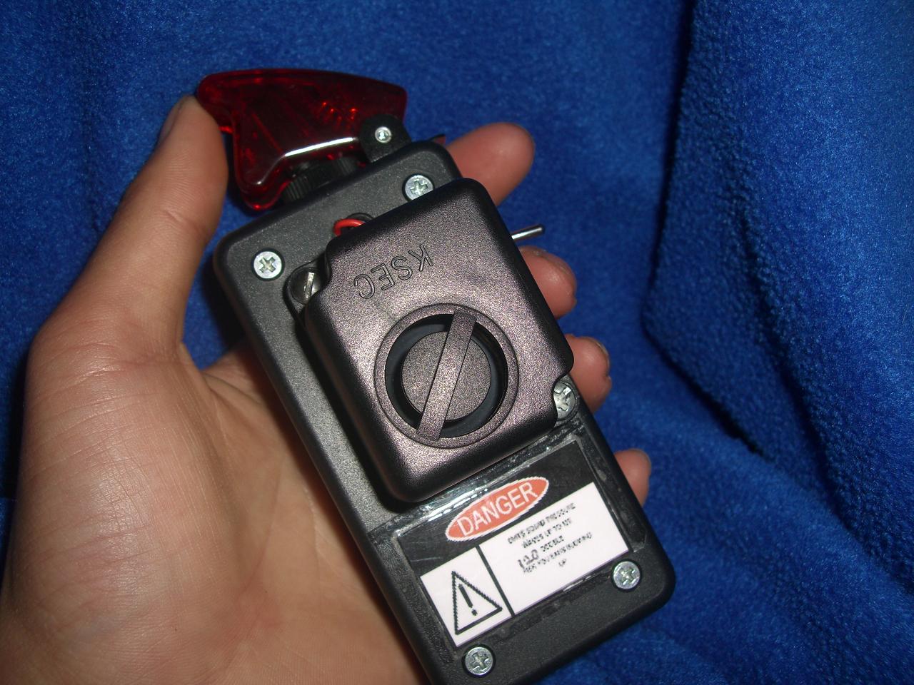This is a device put together from things available at your local electronics store, this thing is just for some sense of security when your in public, with one flick of a switch it produces ear piercing 120 decibel sirens. The lump in the front is the piezo siren it is powered by a 9v battery wired inside, to change i just unscrew the four screw and replace the 9v in its clip, this thing is very rugged and will last many years