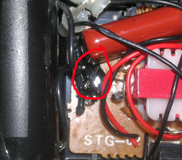 OK I have a little problem. I installed a stun gun ignition in my combustion spud, and it was working well except I noticed that my wires weren't quite insulated enough because occasionally it would arc between wires, so I took everything apart and used some +33 electrical tape on the wires which solved the problem, HOWEVER I noticed that there was some arcing INSIDE the stun gun case. I circled what was arcing... except it may be hard to see, I put liquid electrical tape on the problem area. It looks like two metal bands in an "X" form, and it arcs between them.