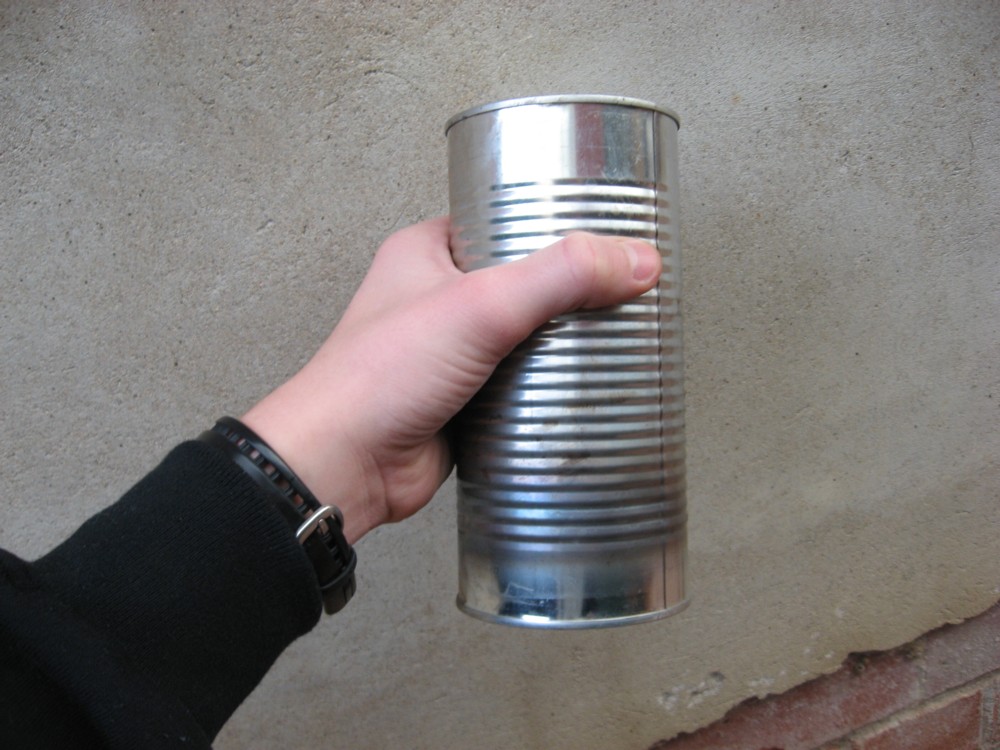 Do you have any good strong magnets? Perhaps use'm to hold the can down in the water by placing them below the pan.