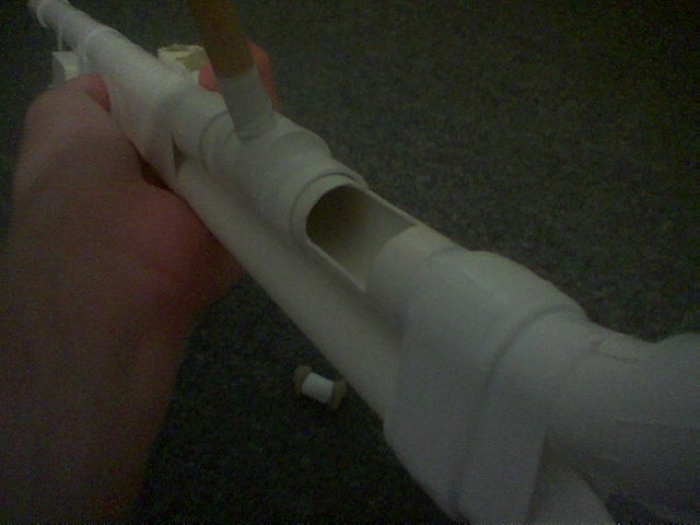 I have upgraded this shooter, the new model now has a flexible tube as a mouthpiece. This caused a problem with loading so I fitted a simple breech loading set-up.
