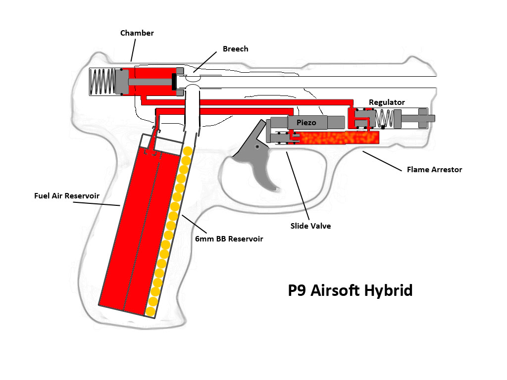 That's not a bad idea about locking the piston back. Except, how I've envisioned it, the fill valve is always open until the trigger is pulled, so then fuel/air would always be venting unless you continued to pull the trigger. I suppose you could have it only fill at the midpoint of trigger pull, but then you might not be able to squeeze that fast. Also, what about throwing off aim with the piston snapping forward?