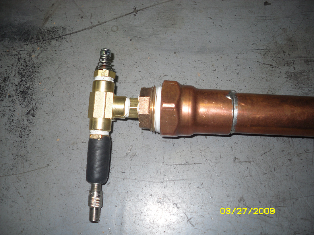 Type L... solder/thread adapter on pilot end, 1" to .5" reducer(solder/solder) on barrel end, brass 1"to.25" bushing for pilot, brass .25" close nipple to .25" tee, fill schrade on one leg, fire schrader on other....