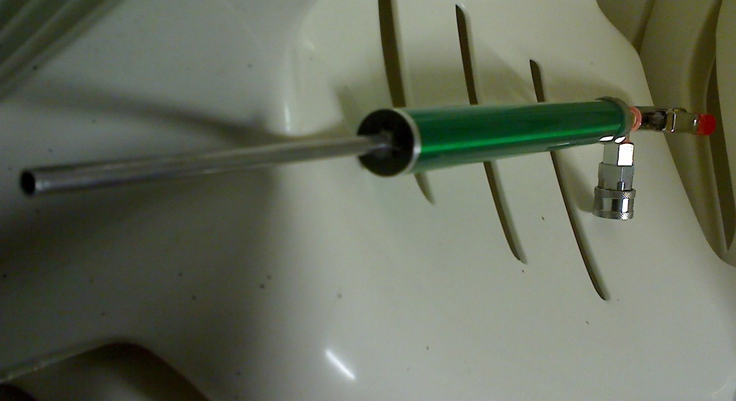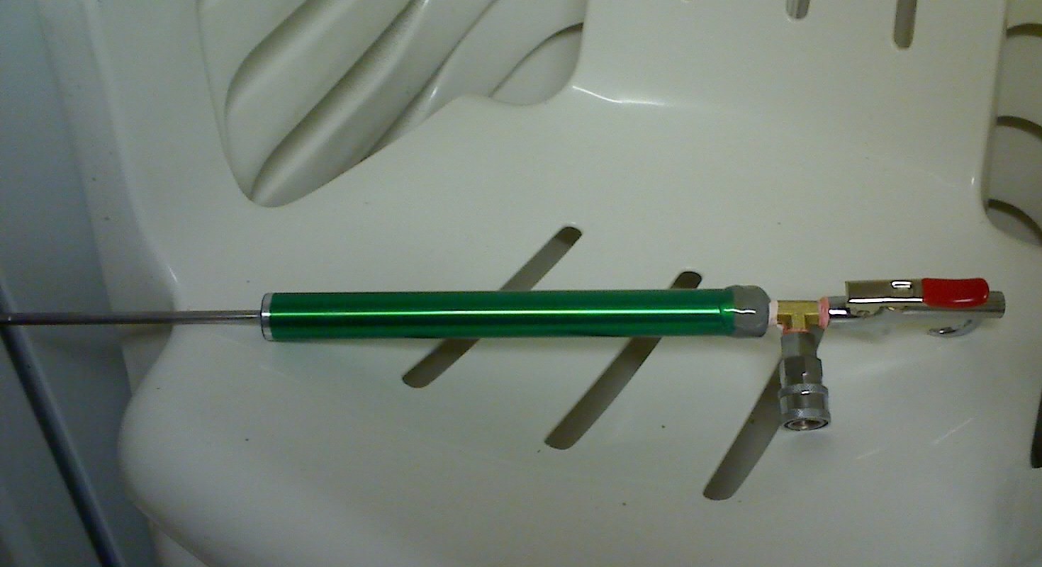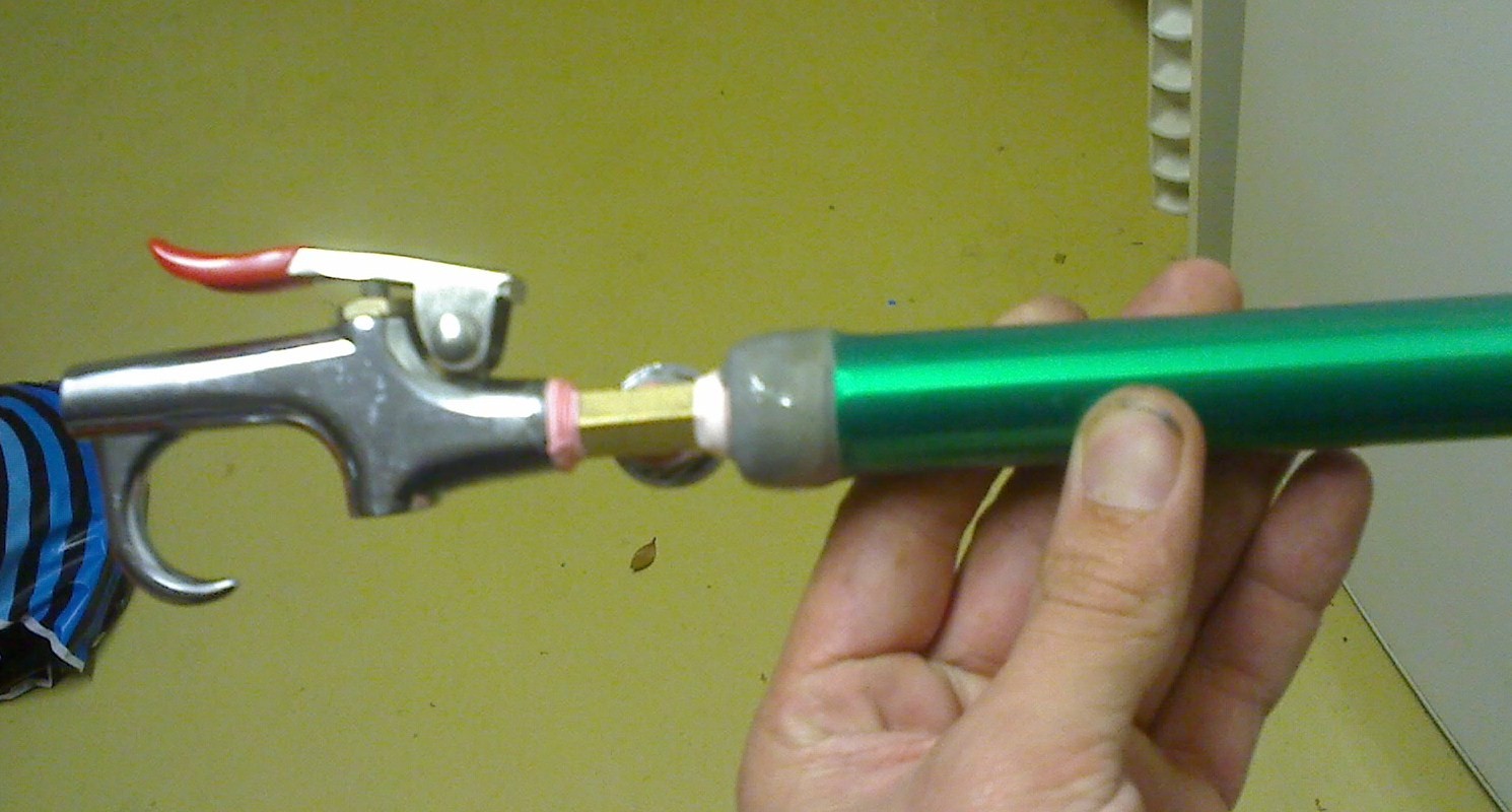 Well here is my first coaxial piston gun, its made from aluminium tubing, i found in side a laser printer refill cartrigde ( the main roller,the green tube) with a 5 mm barrel (bore) 4mm,refill is via quick connect and is piloted by a blow gun.. the piston is made from a timber broom stick cut to size with a neoprene sealing face and semi-resessed o-ring ,all joints are epoxy resin