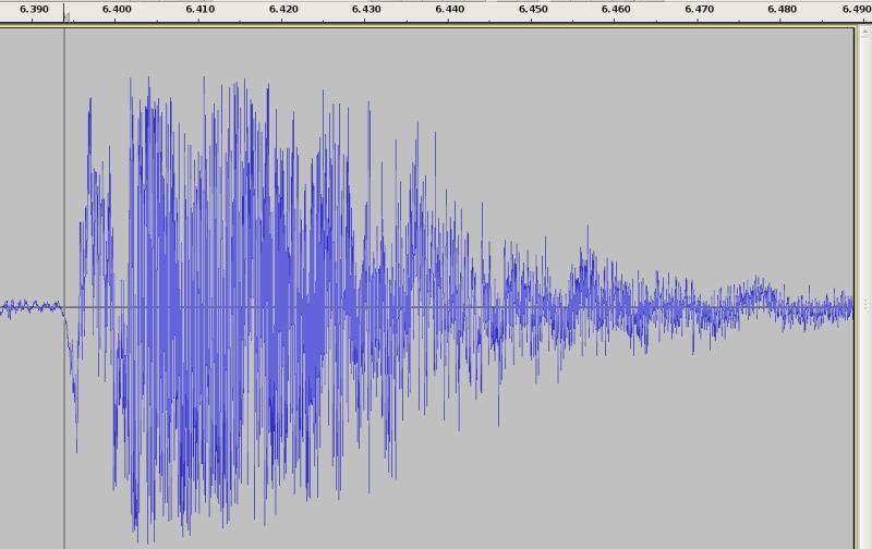 Just to show the flow of a QDV, this is the Audacity waveform showing 100ms of the sample recording. The sample is from 6.39 sec to 6.49 seconds of the recording. As you can see the entire discharge is pretty much completed in the 100 ms. This recording is of the 3 gallon tank with the 2 inch valve, quite considerably larger than the 3 liter pony tank in your launcher. Get a recording and compare performance.