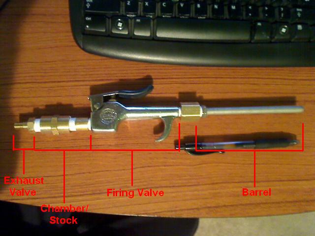 I've redesigned... once again... because I was making it way more complex than it had to be. I threw out the idea of making a piston valve, started from scratch, and this is what I came up with. Thanks to c11man's info on the bigger the chamber, the better for pneumatics, I'll have to make a bigger chamber.