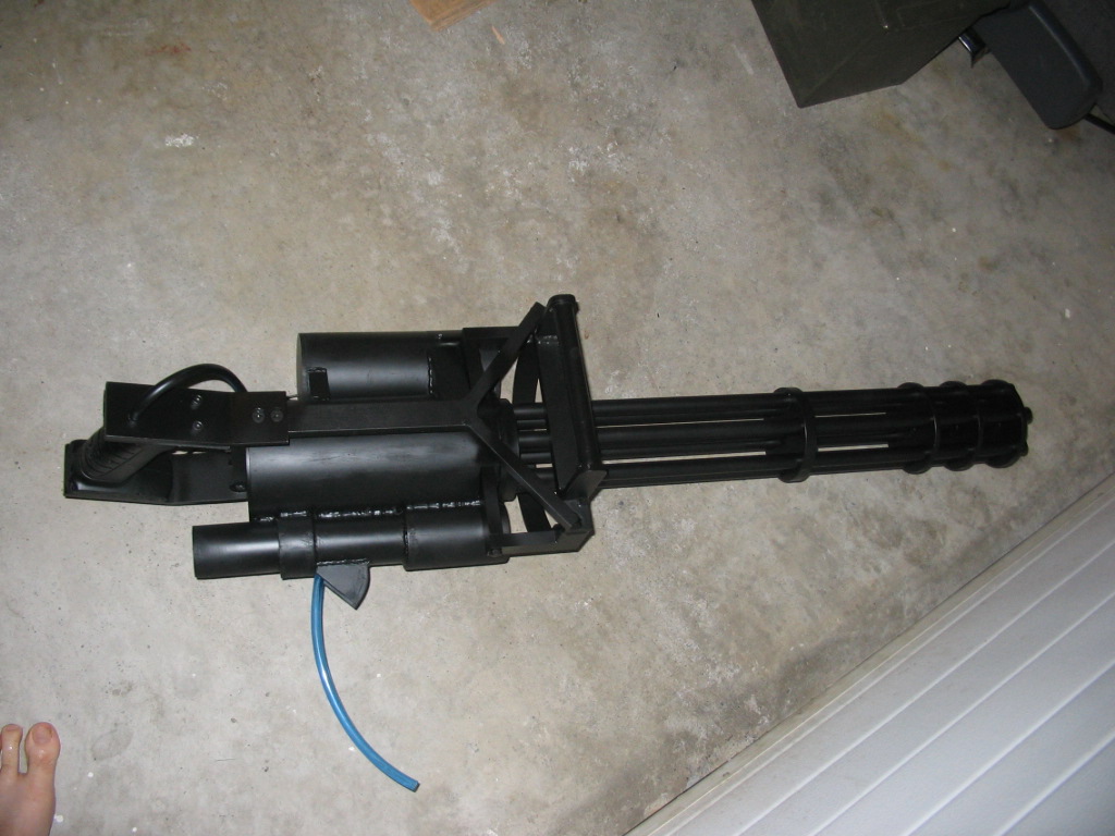 I'm building an airsoft minigun. All is almost done now. Is fire throught a hidden barrel in the middle of the rotating barrels. I have installed an airsoft hop-up units with it.