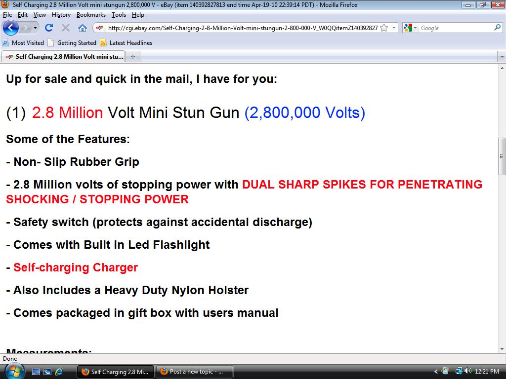 Take the example I've posted below: 2.8 million volts?! Well, ideally, the voltage breakdown for an air spark gap is around 25kv/inch. Therefore, according to the manufacturer, we could make a ~37" spark gap with their stungun! Horseexcrement.