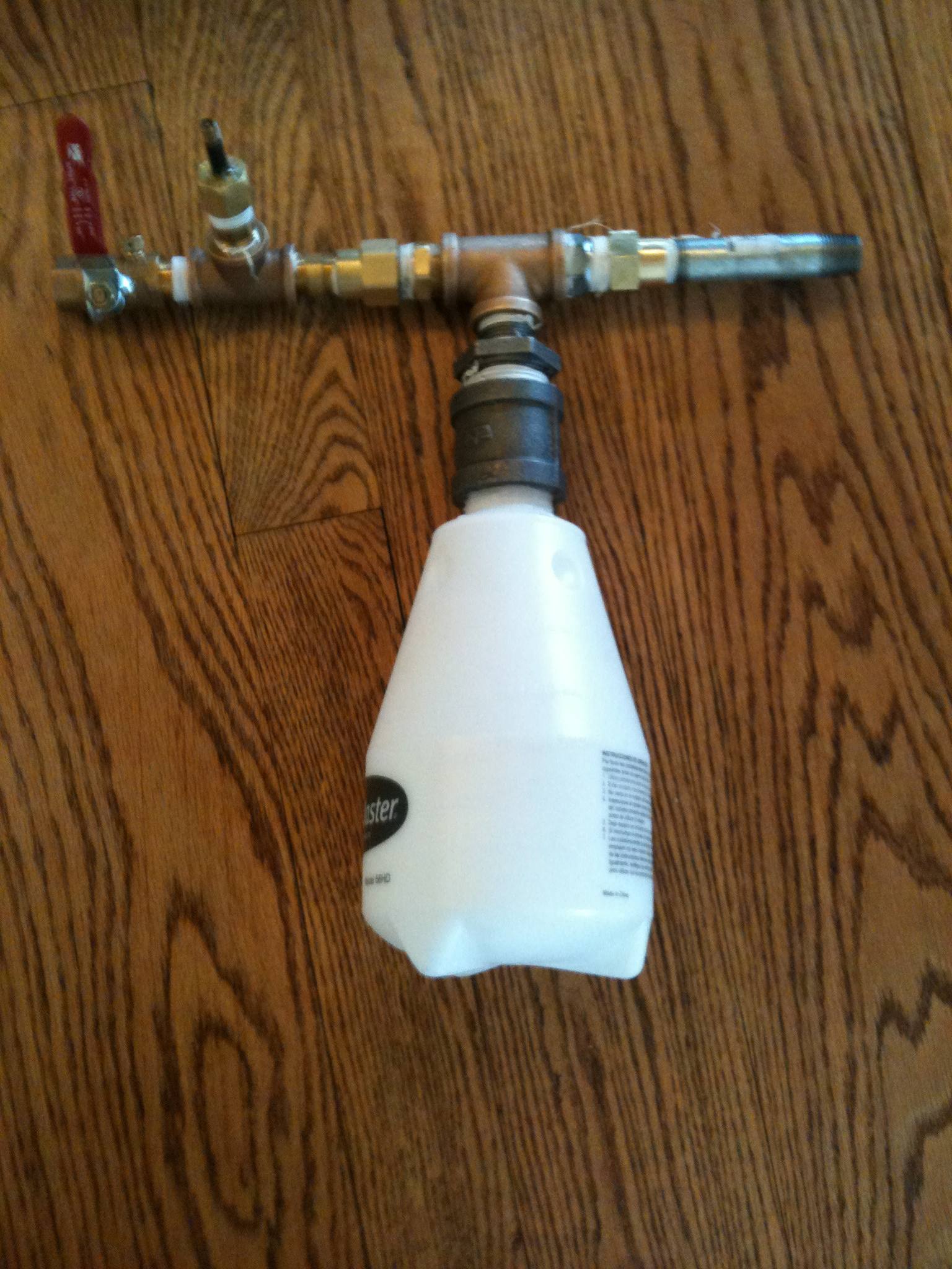 Anyway, I constructed the gun and the valve. It took a couple of tries, but I got the piston working perfectly and sealing off the barrel. Victory! In his video to store the air he uses a fire extinguisher. I didn't have a fire extinguisher at the time so I just used a water bottle with some teflon tape. While obviously not a permanent or very safe solution, the water bottle held air fairly well and showed me that the valve worked. I decided to make a more permanent solution, but not with a fire extinguisher because I thought they were a little bit too expensive. Instead I used a sturdy plastic container from a sprayer. I pumped it up and there were no leaks anywhere and it looked like everything was going well, but when I pulled the ball valve nothing happened. I tried it again and same results. There were no leaks and the piston was still working perfectly. I then reverted back to the water bottle and it shot. And then I went back to the sprayer semi-permanent solution and it didn't work. Anybody have ideas as to why it didn't work?
