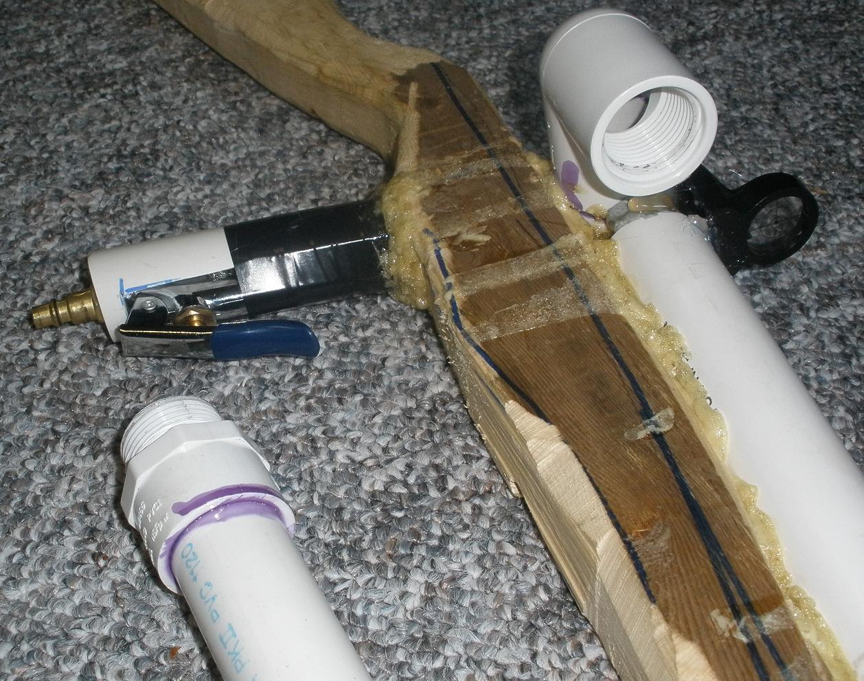I made this for airsoft skirmishes. I will be using a regulated oxygen tank setup (eventually). It looks ugly but it performs great. Shreads through tin cans, cardboard boxes, milk jugs, and even ply-wood! I am debating if i should paint over the wood stock or just paint the plastic. Whats also really cool about this gun is i can make as many hoppers as i want and they can be as big as the gun will allow.