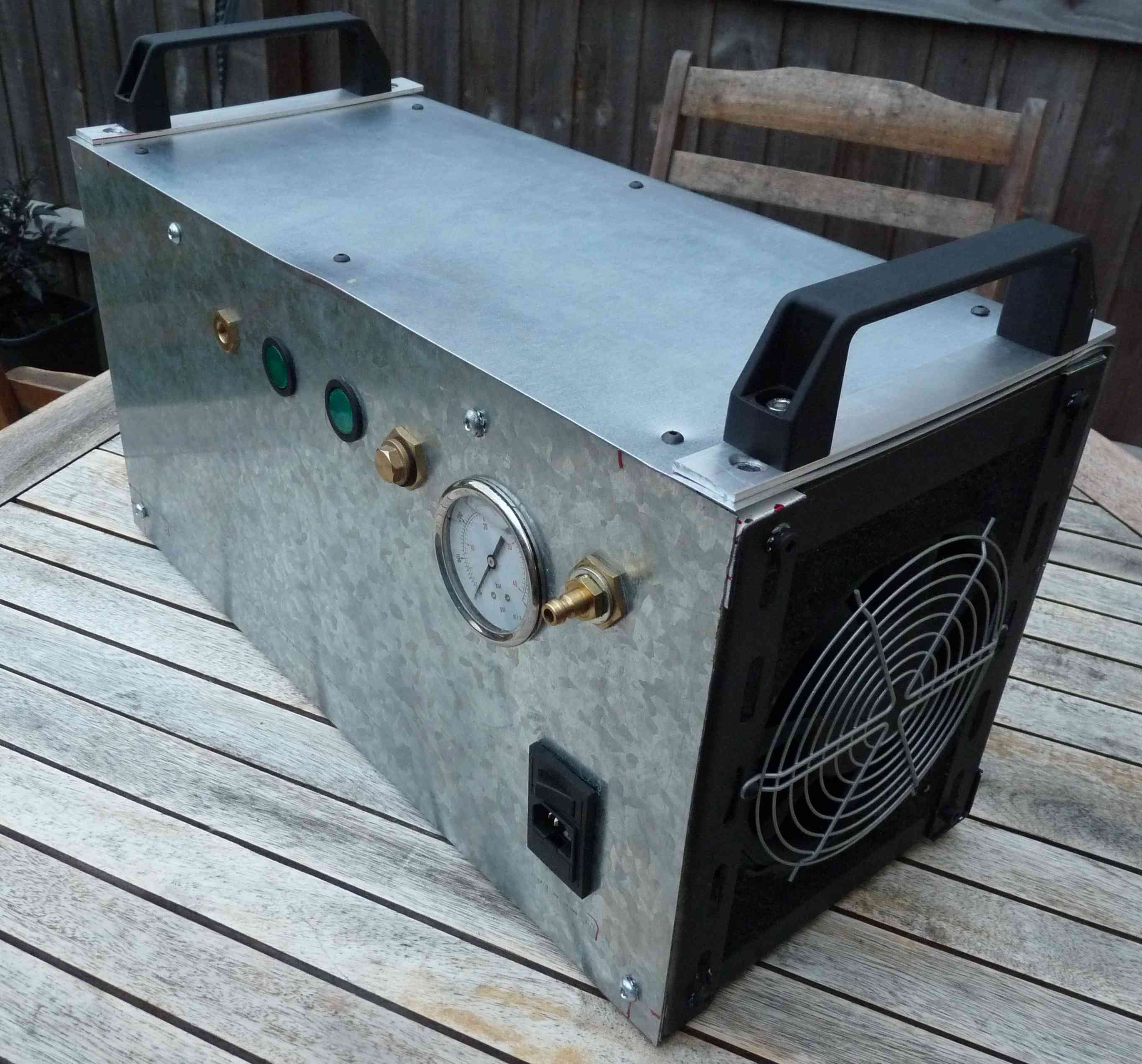 I got around to finishing this at last, the case is built out of scrap steel angle and some galvanised steel sheet, the fans are mounted in the ends in a push pull arrangement which gives very good airflow around the compressor shell.