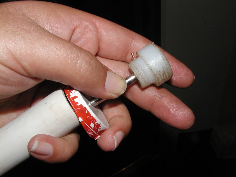 Even with a good bumper be careful. This cannon did have a good bumper. My Mouse Musket used to break pistons at the rate of about 1 per year. True to form, this PVC part lasted about a year. The dense foam bumper is about half as long as the piston. The foam pad is cut from a garden knee pad.