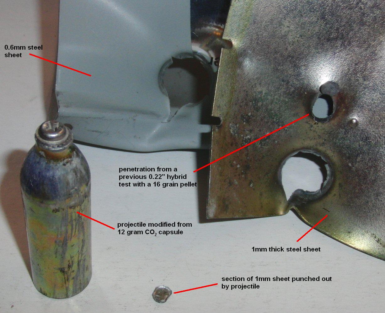 edit: took the 0.75" hybrid to 20x fired at 1mm steel plate over a 0.6mm power supply case, it didn't penetrate fully but still, impressive damage.