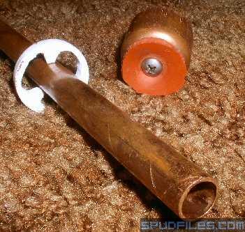 The internals of the gun. They are laid out how it would be inside the chamber. The white thing is to center the barrel. It is just a ground out and cut down 1" end cap. Sheet PVC would work also, as would wood or anything really. The back of the chamber (right end) is plugged with the original bike pump plug. It is held into place with the 1/4" pipe nipple that the exhaust ball valve is attached to.