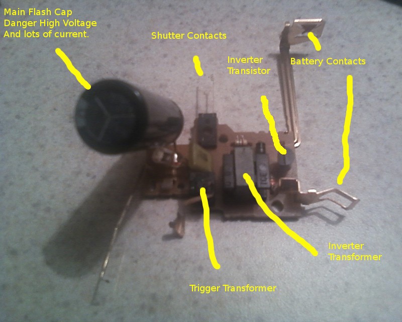 After removing the flash circuit from a disposable camera and successfully liberating the flash bulb without damage to any of the internals, I am horribly confused.