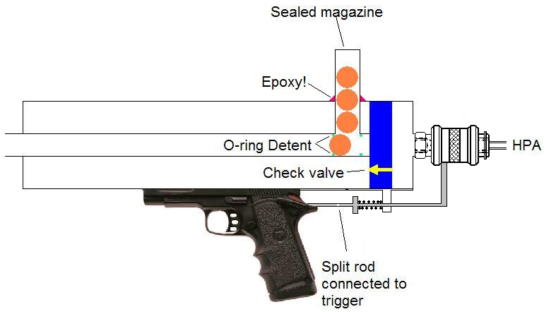 What are you using to block the flow of HPA through the slide valve? Its my understanding that the slide valve is just a pass through which has the ability to vent the pressure inside it to atmosphere. There would be nothing to stop the HPA from flowing out of the slide valve while firing from the HPA source unless a separate cut off valve was used... just trying to understand the drawings, sorry.jackssmirkingrevenge wrote:It would work as drawn but a slide valve pilot would be easier to put together and much more efficient too as the HPA feed is blocked off during firing.