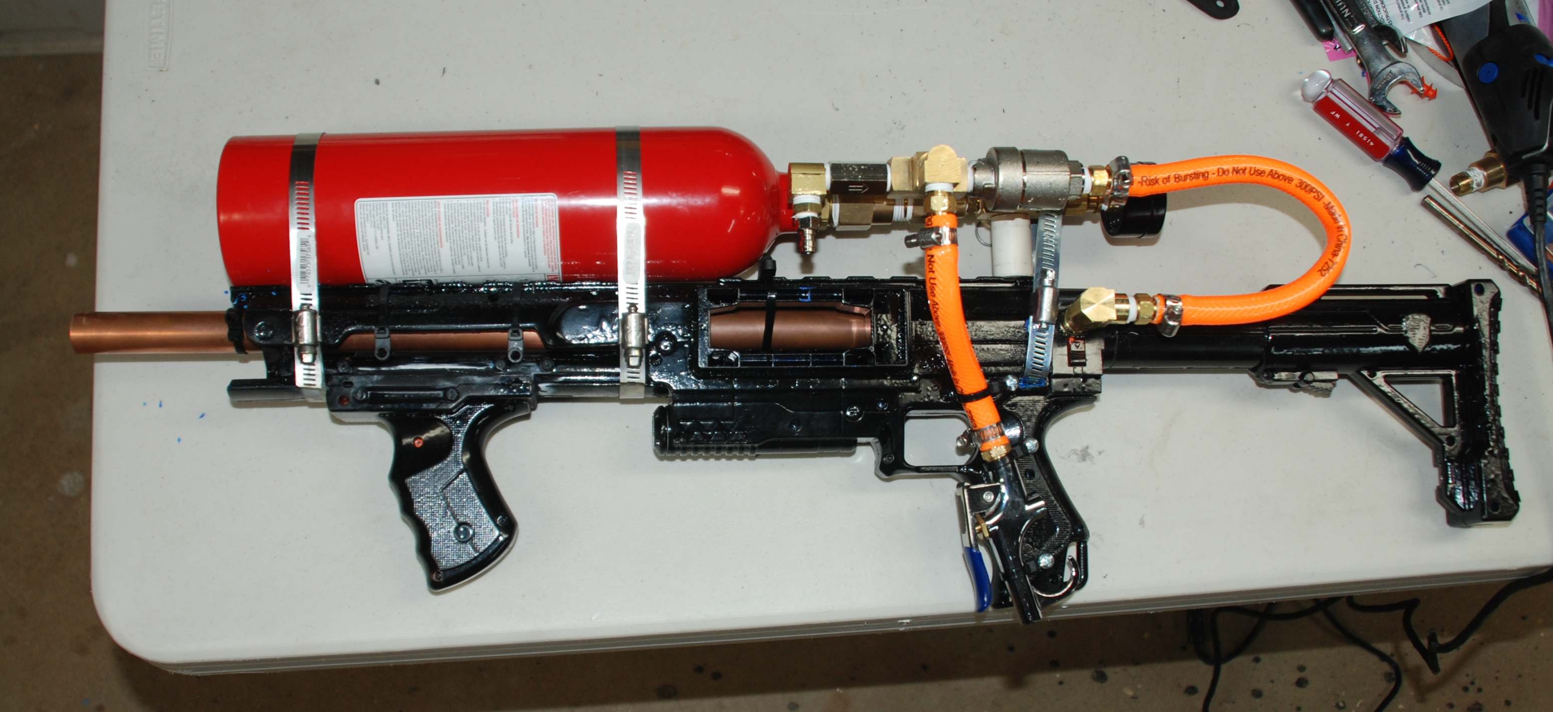 Nice gun, cool design. If I were you I would paint your fire extinqisher to match your gun and possibly all the other parts you can see.