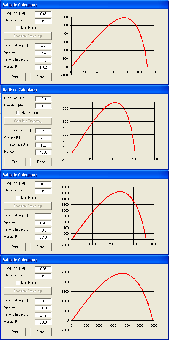 Attached some GGDT simulations using a 20 gram projectile in a 1 inch barrel fired at high subsonic velocity. In one series I varied the drag coefficient, in the other the projectile diameter (1 inch -> 0.5 inch -> 0.25 inch -> 0.125 inch), in all cases the velocity and weight was kept constant.