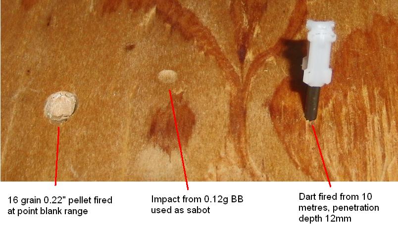 I had to trim the tail down because I went overboard with the milling but it made no effect on performance, flew superbly at 10 metres fired at 1/2" plywood. Compare the performance with a lead pellet from the same launcher at the same pressure fired at point blank range, the performance benefits of using saboted projectiles are plain to see.