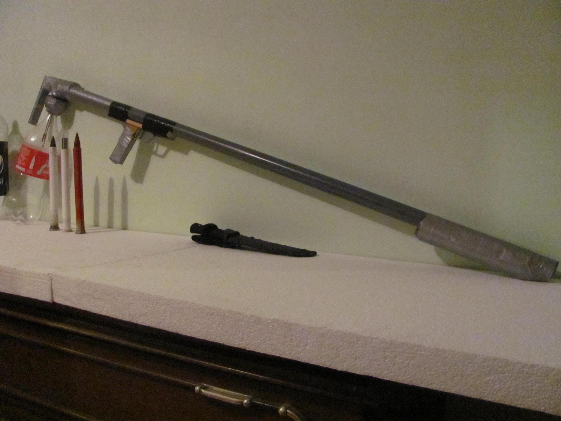 Here's my new special zombie survival spudgun. It fires 20mm polypropylene projectiles with a steel penetrator. The barrel is 28mm inner diameter so the projectiles are with a little increased diameter at the one end. The fuel is in pre-loaded 2l coke bottles(two under my bed and 3 over the wardrobe) and is H2:N2O 1:1 or Methanol and N2O. The ignition is with two professional pyrotechnic ignitors powered by two AA alkaline batteries. The trigger is two well sanded copper plates with a plastic safety witch goes to the one side to disengage. The barrel is ported. Allowing the pressure to drop before the projectile leaves the barrel makes every shot ridiculously accurate. The gases pass trough steel wool witch cools them and adds a little sound suppressing effect. It may look a little ghetto but I'm on a budget here :mrgreen: and the tape isn't holding anything critical. I couldn't make a video with it but here's a link with an equivelent gun (that one is a prototype with lighter piezo ignition, no glue used to hold the cut off bottle cap in the gun :D but still no fail of anykind)