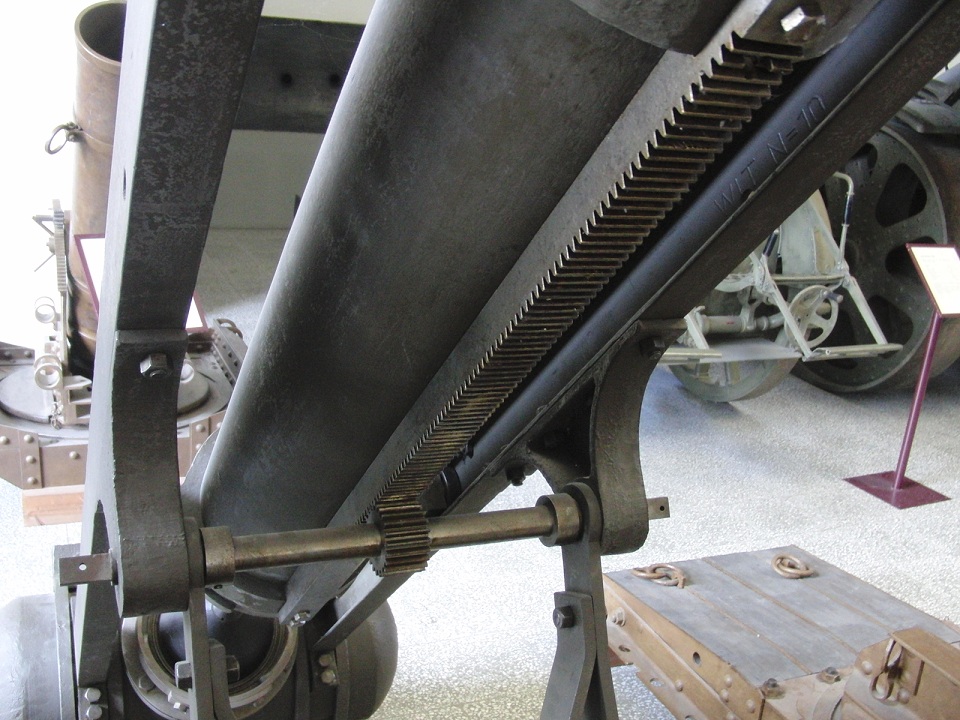 20cm reloading rack and pinion. Elevation was fixed with range being varied by altering pressure.