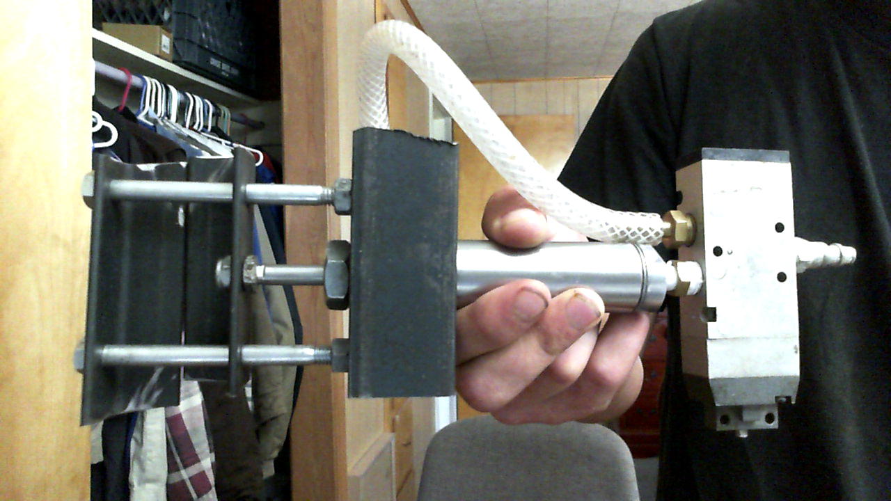 Went ahead and made a qev+poppet valve setup. My poppet valve is 125psi and my compressor is 100psi, so I Macgyvered an external spring to lower its opening pressure. The bursts of air are to short to get a full extension of the cylinder.