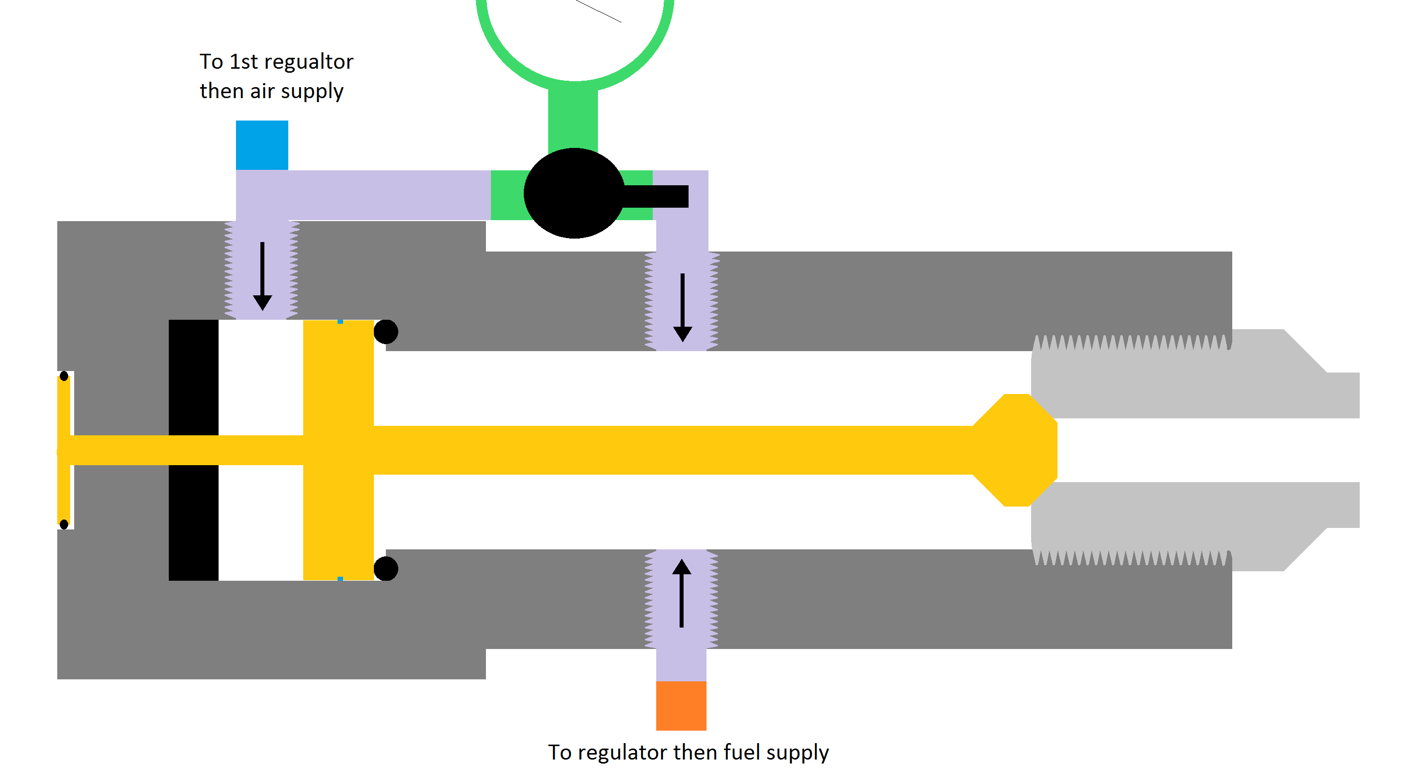 Firstly the arrows indicate non-return valves or check valves. The idea works basically like a co-axial piston valve pneumatic, except I wanted the two chambers completely separate so as to not let the fuel seep into the rear chamber and igniting, which means there would be little or no pressure drop in the rear chamber and the gun simply wouldn't work. So I introduced check valves to have equal pressure in each chamber, but with the rear just air/oxygen, and the primary the fuel mix.