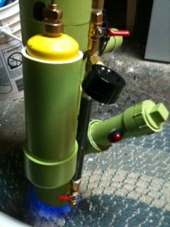 The picture of the exploded cannon is the old version (2 separate metered pipes for MAPP $ O2)- this version has gas bottles attached with clamps. Pretty ghetto. The other pics are all of the cannon post-rebuild. I know the chamber is a bit aggressive, but I love boom-boom.